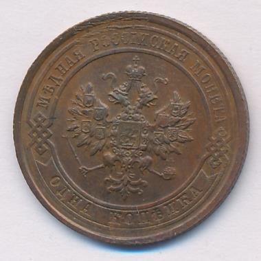 Лицевая сторона — двуглавый орел, надпись МЕДНАЯ РОССIЙСКАЯ МОНЕТА и обозначение номинала (одна копейка); оборотная — обозначение номинала (1 копейка) в бусовом ободке и дата. Нормативный вес — 3,28 грамма, гурт рубчатый.