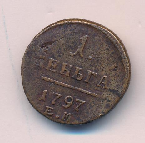Лицевая сторона — вензель Павла I под короной, оборотная — номинал (1 деньга) и дата. Нормативный вес — 5,12 грамма, гурт — шнур.