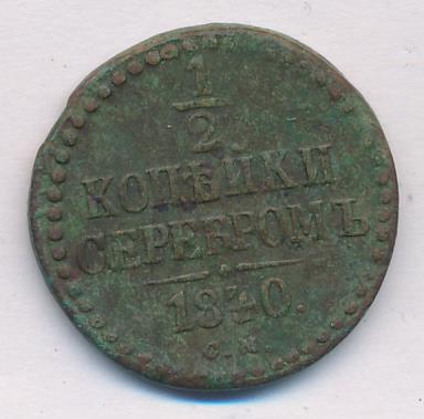 На новых монетах равенство серебряному курсу указано прямо в номинале: «1/2 КОПЕЙКИ СЕРЕБРОМ». Указ об их выпуске следует 6 сентября 1840 года («О новой медной монете на серебро 16-рублевого в пуде достоинства»). Массовая чеканка началось за год до этого на Екатеринбургском (знак ЕМ) и Сузунском (знак СМ) дворах. В качестве временной меры в 1840-1843 годах к ним подключается Ижорский завод (знак СПМ). С 1844 года после «значительного скопления медной монеты в народном обращении» в Екатеринбурге производство прекращается, а в Сузуне сокращается. Варшавский двор (знак MW), получив разрешение на выпуск общегосударственной монеты, успел отчеканить ее лишь в небольшом количестве в 1848 году.