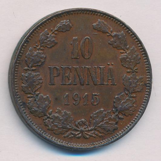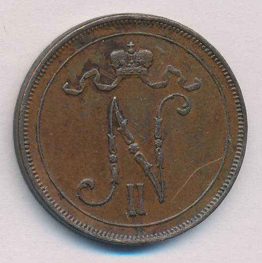 Лицевая сторона — вензель Александра II, оборотная — номинал (10 PENNIA) в венке из дубовых ветвей и дата. Нормативный вес — 12,80 грамма, гурт гладкий.