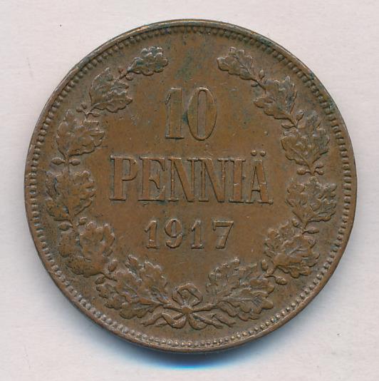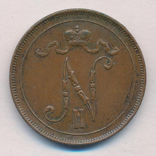 Лицевая сторона — вензель Александра II, оборотная — номинал (10 PENNIA) в венке из дубовых ветвей и дата. Нормативный вес — 12,80 грамма, гурт гладкий.