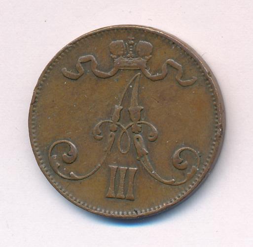 Лицевая сторона — вензель Александра II, оборотная — номинал (5 PENNIA) и дата. Нормативный вес — 6,40 грамма, гурт гладкий.
