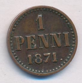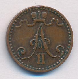 Лицевая сторона — вензель Александра II, оборотная — номинал (1 PENNIA) и дата. Нормативный вес — 1,28 грамма, гурт гладкий.