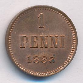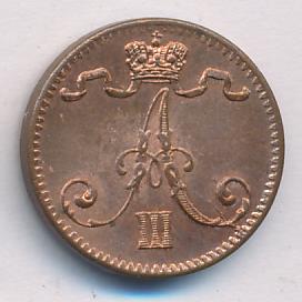 Лицевая сторона — вензель Александра II, оборотная — номинал (1 PENNIA) и дата. Нормативный вес — 1,28 грамма, гурт гладкий.