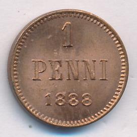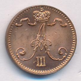 Лицевая сторона — вензель Александра II, оборотная — номинал (1 PENNIA) и дата. Нормативный вес — 1,28 грамма, гурт гладкий.