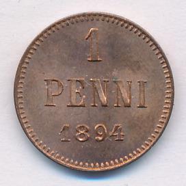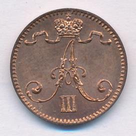 Лицевая сторона — вензель Александра II, оборотная — номинал (1 PENNIA) и дата. Нормативный вес — 1,28 грамма, гурт гладкий.