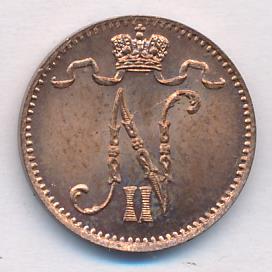Лицевая сторона — вензель Александра II, оборотная — номинал (1 PENNIA) и дата. Нормативный вес — 1,28 грамма, гурт гладкий.