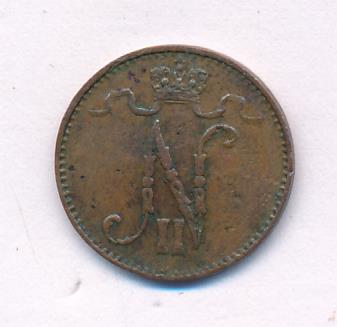 Лицевая сторона — вензель Александра II, оборотная — номинал (1 PENNIA) и дата. Нормативный вес — 1,28 грамма, гурт гладкий.