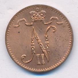 Лицевая сторона — вензель Александра II, оборотная — номинал (1 PENNIA) и дата. Нормативный вес — 1,28 грамма, гурт гладкий.