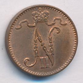 Лицевая сторона — вензель Александра II, оборотная — номинал (1 PENNIA) и дата. Нормативный вес — 1,28 грамма, гурт гладкий.