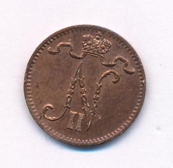 Лицевая сторона — вензель Александра II, оборотная — номинал (1 PENNIA) и дата. Нормативный вес — 1,28 грамма, гурт гладкий.