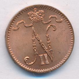 Лицевая сторона — вензель Александра II, оборотная — номинал (1 PENNIA) и дата. Нормативный вес — 1,28 грамма, гурт гладкий.