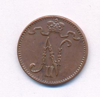 Лицевая сторона — вензель Александра II, оборотная — номинал (1 PENNIA) и дата. Нормативный вес — 1,28 грамма, гурт гладкий.