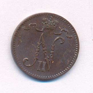 Лицевая сторона — вензель Александра II, оборотная — номинал (1 PENNIA) и дата. Нормативный вес — 1,28 грамма, гурт гладкий.