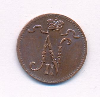 Лицевая сторона — вензель Александра II, оборотная — номинал (1 PENNIA) и дата. Нормативный вес — 1,28 грамма, гурт гладкий.