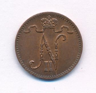 Лицевая сторона — вензель Александра II, оборотная — номинал (1 PENNIA) и дата. Нормативный вес — 1,28 грамма, гурт гладкий.