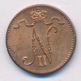 Лицевая сторона — вензель Александра II, оборотная — номинал (1 PENNIA) и дата. Нормативный вес — 1,28 грамма, гурт гладкий.