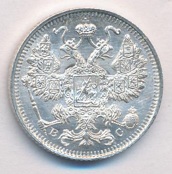 Лицевая сторона — гербовый орел, оборотная —обозначение номинала (15 копеекъ), окруженное венком из лавровой и дубовой ветвей и дата.