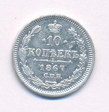 Лицевая сторона — гербовый орел, оборотная —обозначение номинала (10 копеекъ), окруженное венком из лавровой и дубовой ветвей и дата.