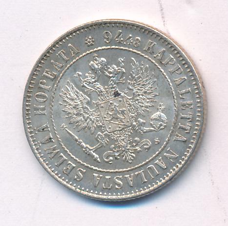 Лицевая сторона — российский двуглавый орел с гербом Великого княжества Финляндского на груди в кольцевой надписи с указанием количества штук (94,48) из фунта сплава серебра, оборотная — номинал и дата в венке из дубовых листьев. Проба — 868, нормативный вес — 5,18 грамма, гурт рубчатый.