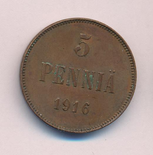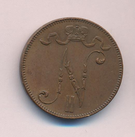 Лицевая сторона — вензель Александра II, оборотная — номинал (5 PENNIA) и дата. Нормативный вес — 6,40 грамма, гурт гладкий.
