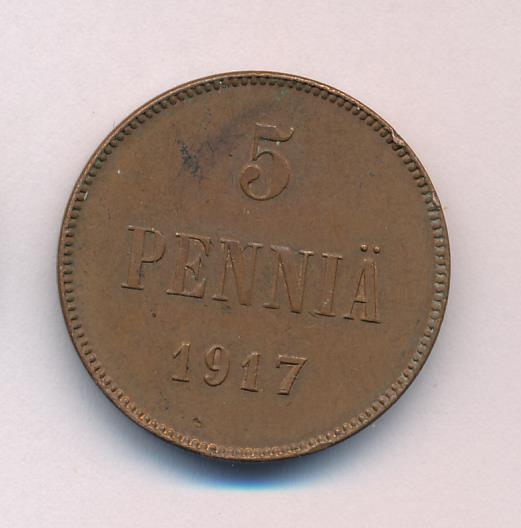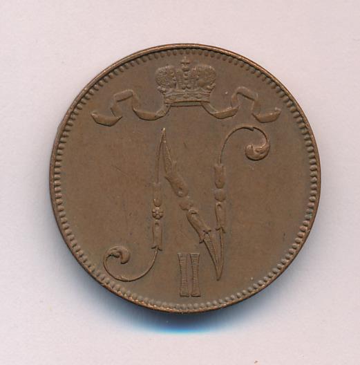 Лицевая сторона — вензель Александра II, оборотная — номинал (5 PENNIA) и дата. Нормативный вес — 6,40 грамма, гурт гладкий.