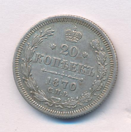 Лицевая сторона — гербовый орел, оборотная —обозначение номинала (20 копеекъ), окруженное венком из лавровой и дубовой ветвей и дата.