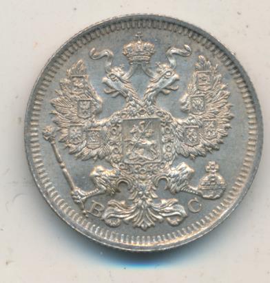 Лицевая сторона — гербовый орел, оборотная —обозначение номинала (20 копеекъ), окруженное венком из лавровой и дубовой ветвей и дата.