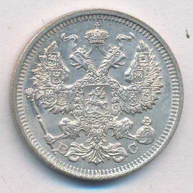 Лицевая сторона — гербовый орел, оборотная —обозначение номинала (20 копеекъ), окруженное венком из лавровой и дубовой ветвей и дата.