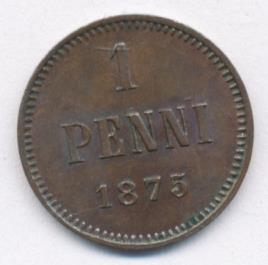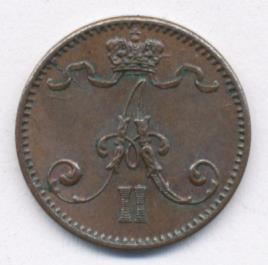 Лицевая сторона — вензель Александра II, оборотная — номинал (1 PENNIA) и дата. Нормативный вес — 1,28 грамма, гурт гладкий.