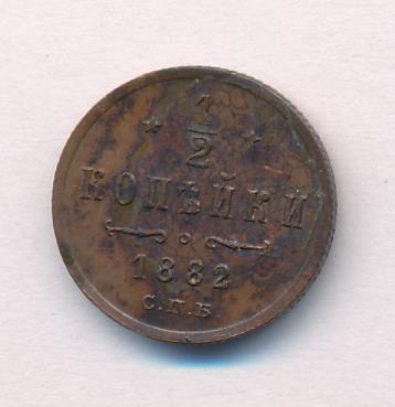 Лицевая сторона — вензель Александра II в венке из лавровой и дубовой ветвей; оборотная — обозначение номинала (1/2 копейки) и дата. Нормативный вес — 1,64 грамма, гурт рубчатый.