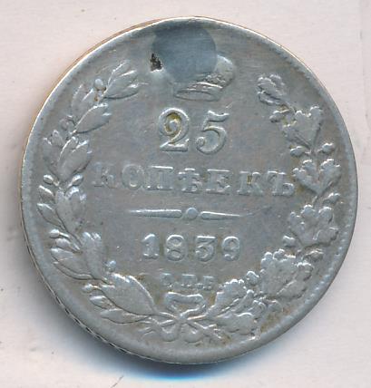 Лицевая сторона — новый гербовый орел с поднятыми крыльями и надпись «ЧИСТОГО СЕРЕБРА 1 ЗОЛОТНИКЪ 5 ДОЛЕЙ», оборотная —обозначение номинала (25 копеекъ), окруженное венком из лавровой и дубовой ветвей и дата.