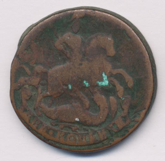 Лицевая сторона — Георгий Победоносец и обозначение номинала (две копейки) в картуше, оборотная — сложный симметричный вензель Елизаветы Петровны и дата. Нормативный вес — 20,48 грамма.