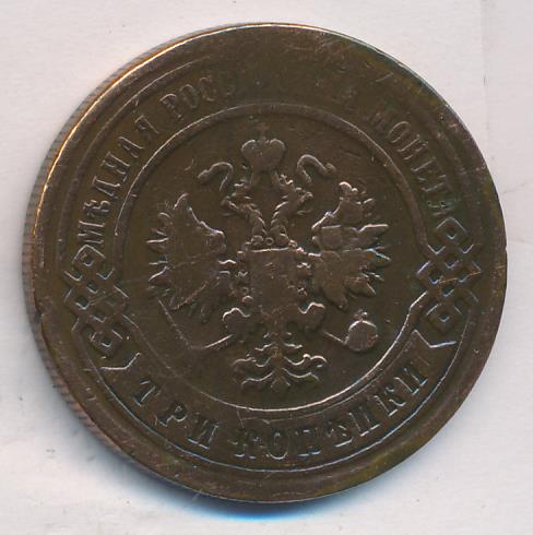 Лицевая сторона — двуглавый орел, надпись МЕДНАЯ РОССIЙСКАЯ МОНЕТА и обозначение номинала (три копейки); оборотная — обозначение номинала (3 копейки) в бусовом ободке и дата. Нормативный вес — 9,83 грамма, гурт рубчатый.