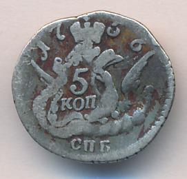 Новый пятикопеечник имеет то же оформление в стиле барокко, что и медная копейка 8-рублевой стопы. Первые выпуски отпечатаны на тонких заготовках большего диаметра, но уже в 1756 году диаметр кружка уменьшается для придания монетам большей прочности.