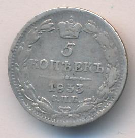 Лицевая сторона — новый гербовый орел с поднятыми крыльями, оборотная —обозначение номинала (5 копеекъ), окруженное венком из лавровой и дубовой ветвей и дата. Проба — 868, нормативный вес — 1,04 грамма.