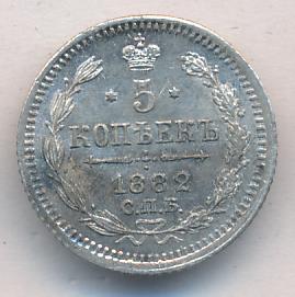 Лицевая сторона — гербовый орел, оборотная —обозначение номинала (5 копеекъ), окруженное венком из лавровой и дубовой ветвей и дата.