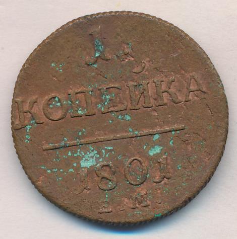 Лицевая сторона — вензель Павла I под короной, оборотная — номинал (1 копейка) и дата. Нормативный вес — 10,24 грамма, гурт — шнур.