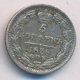 Лицевая сторона — новый гербовый орел с поднятыми крыльями, оборотная —обозначение номинала (5 копеекъ), окруженное венком из лавровой и дубовой ветвей и дата. Проба — 868, нормативный вес — 1,04 грамма.