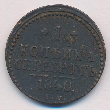 На новых монетах равенство серебряному курсу указано прямо в номинале: «1 КОПЕЙКА СЕРЕБРОМ». Указ об их выпуске следует 6 сентября 1840 года («О новой медной монете на серебро 16-рублевого в пуде достоинства»). Массовая чеканка началось за год до этого на Екатеринбургском (знак ЕМ) и Сузунском (знак СМ) дворах. В качестве временной меры в 1840-1843 годах к ним подключается Ижорский завод (знак СПМ). С 1844 года после «значительного скопления медной монеты в народном обращении» в Екатеринбурге производство прекращается, а в Сузуне сокращается.