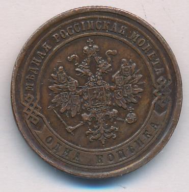 Лицевая сторона — двуглавый орел, надпись МЕДНАЯ РОССIЙСКАЯ МОНЕТА и обозначение номинала (одна копейка); оборотная — обозначение номинала (1 копейка) в бусовом ободке и дата. Нормативный вес — 3,28 грамма, гурт рубчатый.