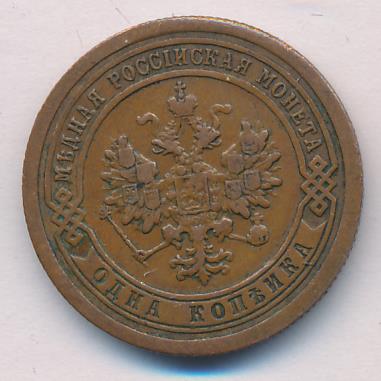 Лицевая сторона — двуглавый орел, надпись МЕДНАЯ РОССIЙСКАЯ МОНЕТА и обозначение номинала (одна копейка); оборотная — обозначение номинала (1 копейка) в бусовом ободке и дата. Нормативный вес — 3,28 грамма, гурт рубчатый.
