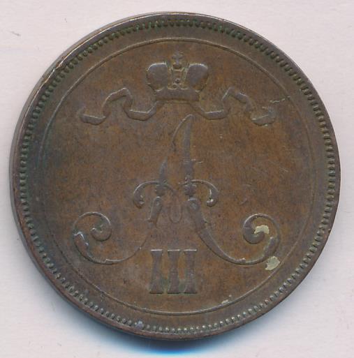 Лицевая сторона — вензель Александра II, оборотная — номинал (10 PENNIA) в венке из дубовых ветвей и дата. Нормативный вес — 12,80 грамма, гурт гладкий.