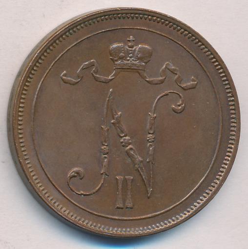 Лицевая сторона — вензель Александра II, оборотная — номинал (10 PENNIA) в венке из дубовых ветвей и дата. Нормативный вес — 12,80 грамма, гурт гладкий.