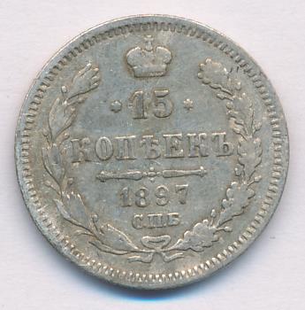 Лицевая сторона — гербовый орел, оборотная —обозначение номинала (15 копеекъ), окруженное венком из лавровой и дубовой ветвей и дата.