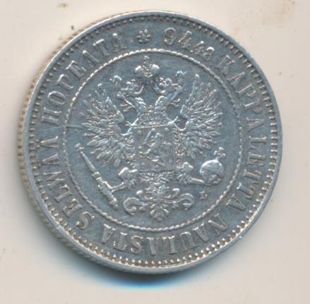 Лицевая сторона — российский двуглавый орел с гербом Великого княжества Финляндского на груди в кольцевой надписи с указанием количества штук (94,48) из фунта сплава серебра, оборотная — номинал и дата в венке из дубовых листьев. Проба — 868, нормативный вес — 5,18 грамма, гурт рубчатый.