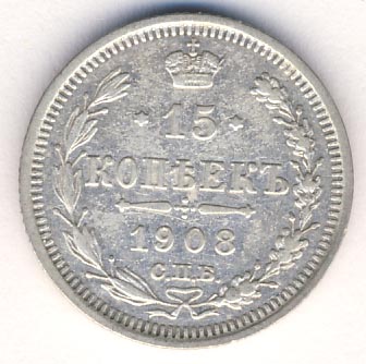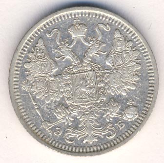 Лицевая сторона — гербовый орел, оборотная —обозначение номинала (15 копеекъ), окруженное венком из лавровой и дубовой ветвей и дата.