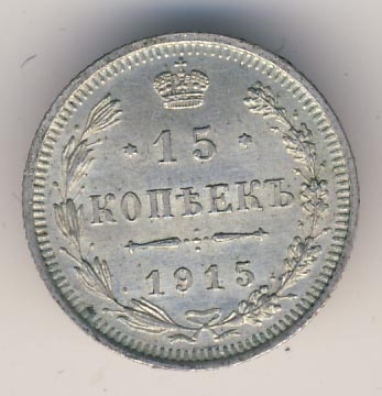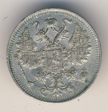 Лицевая сторона — гербовый орел, оборотная —обозначение номинала (15 копеекъ), окруженное венком из лавровой и дубовой ветвей и дата.