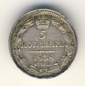 Лицевая сторона — новый гербовый орел с поднятыми крыльями, оборотная —обозначение номинала (5 копеекъ), окруженное венком из лавровой и дубовой ветвей и дата. Проба — 868, нормативный вес — 1,04 грамма.