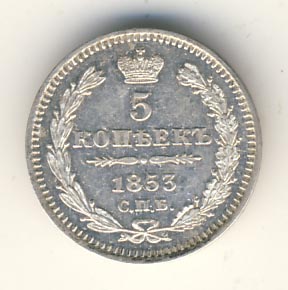 Лицевая сторона — новый гербовый орел с поднятыми крыльями, оборотная —обозначение номинала (5 копеекъ), окруженное венком из лавровой и дубовой ветвей и дата. Проба — 868, нормативный вес — 1,04 грамма.
